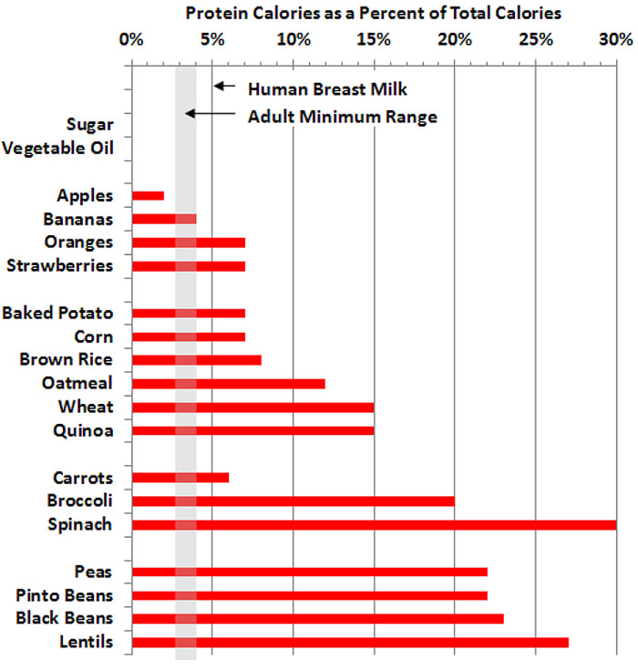 The figure above shows the protein content of all of the foods mentioned above on a single chart so that you can compare them to each other and to the minimum adult range (gray bar) and to the percentage of protein in human breast milk.