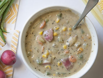 2. Turn stovetop to medium heat. Add celery, carrots, corn, bell pepper, green beans, onion, olive oil and thyme to pot. Cover and sauté until onions are translucent, about 10 minutes. If needed, add 1/4 cup water to keep vegetables from sticking.